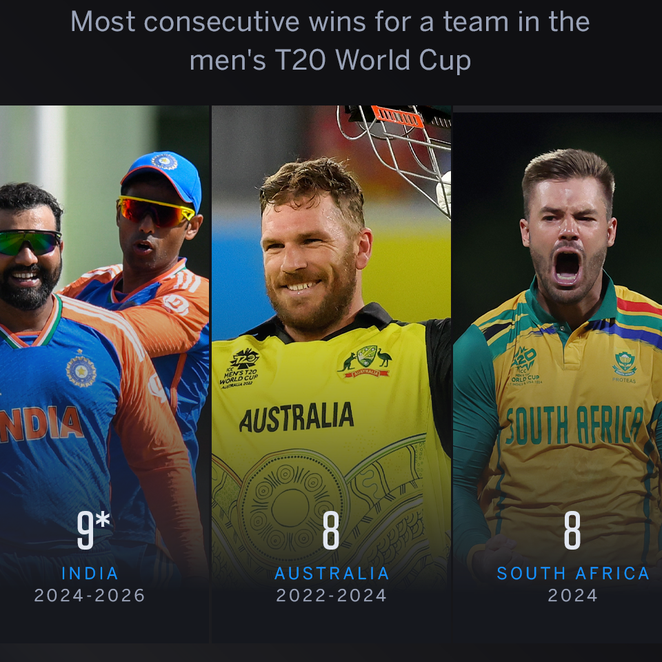 9 Vitórias consecutivas da Índia na Copa do Mundo T20 Masculina, vencendo todas as oito partidas da edição pré-2024. É a mais longa sequência de vitórias de qualquer equipa na competição, superando as oito vitórias consecutivas da Austrália entre 2022 e 2024, enquanto a África do Sul teve oito vitórias antes da final em 2024.