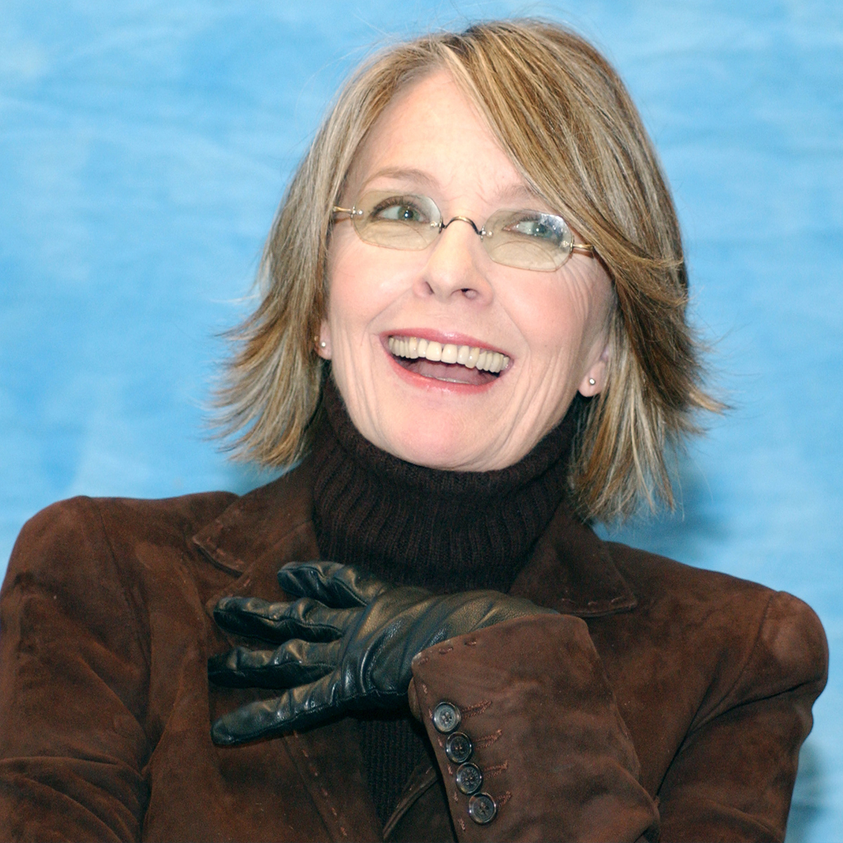 Naquela época, Keaton usava chapéu e óculos tigela exclusivos, completando sua aparência casual com calças cinza quadradas, gola preta e blazer escuro.