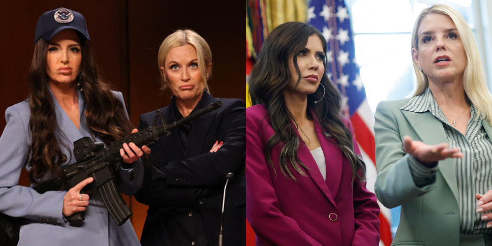 Amy poehler e Tina fey Secretário de Segurança Nacional dos Estados Unidos Kristi liga e o Procurador-Geral dos Estados Unidos Pam Bondi Para o episódio recente de SNLe agora, Bom ela mesma responde.