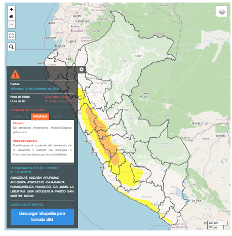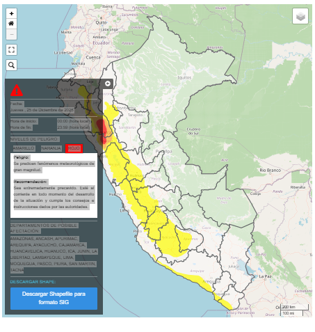Divulgado pelo Serviço Nacional de Meteorologia e Hidrologia (Senamhi) do Peru Aviso meteorológico nº 457 Status vermelhoAdvertindo um Diminuição significativa da temperatura noturna em Montanhas e a costa sul do paísUm fenômeno que anda de mãos dadas com as celebrações Natal 2025.