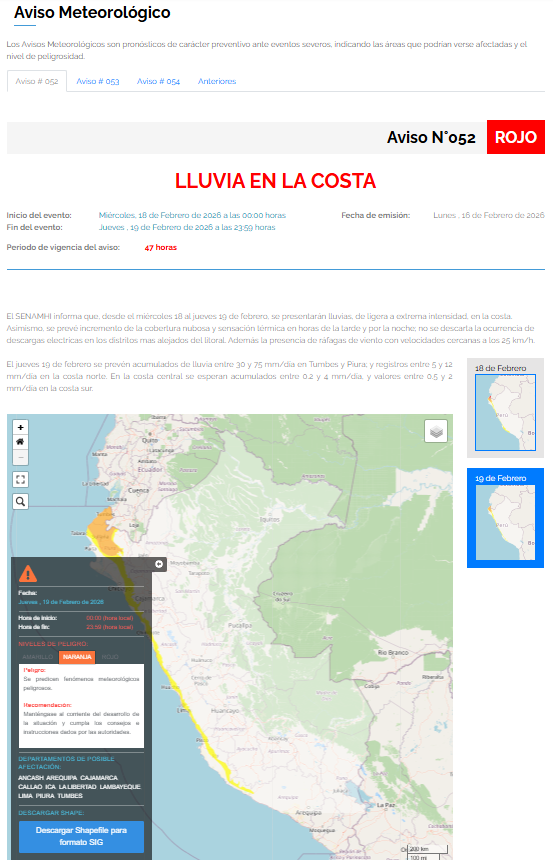 A notificação inclui os seguintes departamentos: Ancash, Arequipa, Cajamarca, Callao, Ica, La Libertad, Lambayeque, Lima, Piura e Tumbes.
