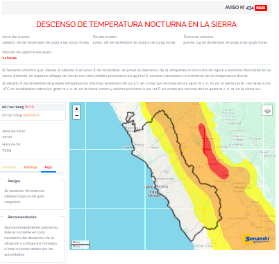 Serviço Nacional de Meteorologia e Hidrologia (Senamhi) Alerta Vermelho Para ele Temperaturas noturnas caem nas montanhas do Peruum evento Duração de 71 horas Isso colocará milhares de famílias em risco Sábado, 6 de dezembro e segunda-feira, 8 de dezembro de 2025.