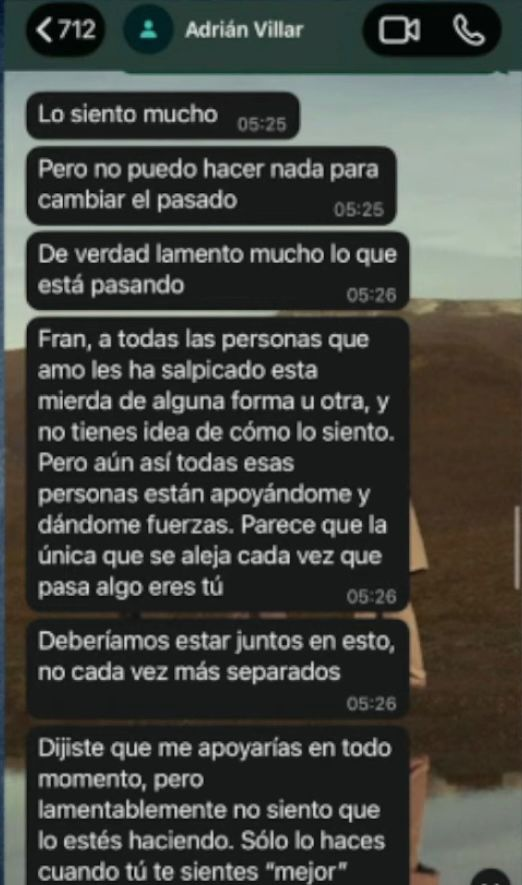 “Fran, todos que eu amo foram tocados de uma forma ou de outra, e você não tem ideia de como me sinto. Porém, todas as pessoas me apoiam e me dão forças, e sempre que algo acontece, você parece ser o único que se afasta. Temos que estar juntos nisso, não juntos, não separados. ‘Ótimo'”, acrescentou, sem receber resposta.