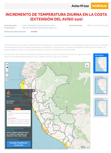 Por outro lado, as temperaturas variam de 31 °C a 37 °C na costa norte, 27 °C a 34 °C na costa central, 27 °C a 32 °C na região metropolitana de Lima e 27 °C a 33 °C na costa sul.