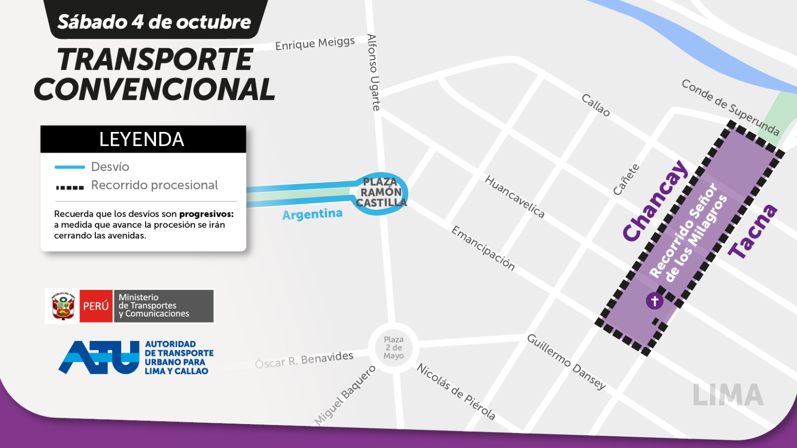 Autoridade de Transporte Urbano para Lima e Callao (ATU) relatado na rota e no plano de desvio que usará isso Sábado, 4 de outubro sob Primeira Procissão Tour a Lord of Miracles 2025começando do meio -dia em Centro de Lima.