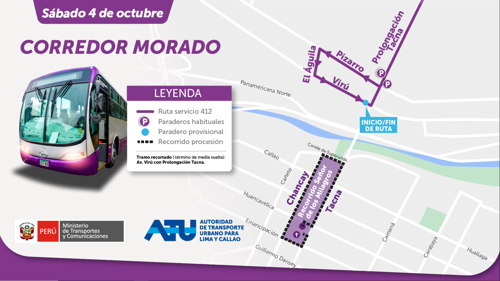 - Serviço 412 Só vai chegar Jr. Viru em Rímac e voltará a San Juan de Lurigancho.