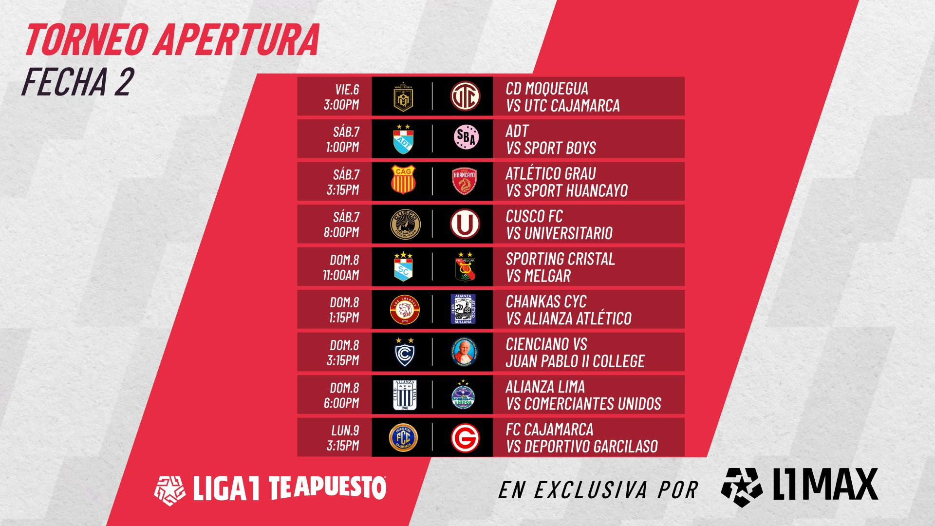 A Aliança de Lima O gol de Alan Cantaro no último minuto garantiu uma vitória vital sobre o Sport Huancayo, desta vez em Matutil para receber o Comerciales Unidos; durante Universidade Estreou-se com o pé direito contra o ADT no Monumental e deu início ao sonho do tetracampeonato, mas desta vez não terá vida fácil, pois visitará o Cusco FC. Cristal EsportivoPor sua vez, empatou na visita do Deportivo Garcilaso a Cusco e enfrenta o FBC Melgar neste fim de semana.