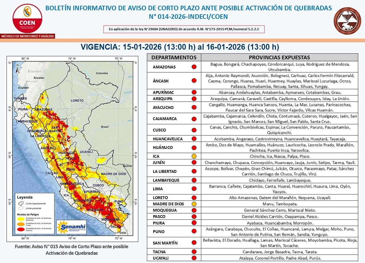 Tome precauções! O Centro Nacional de Operações de Emergência (COEN) e o Serviço Nacional de Meteorologia e Hidrologia (SENAMHI) emitiram o boletim número 014-2026-INDECI/COEN. Eles alertam que 21 áreas do país sofrerão fortes chuvas diretas nos dias 15 e 16 de janeiro.