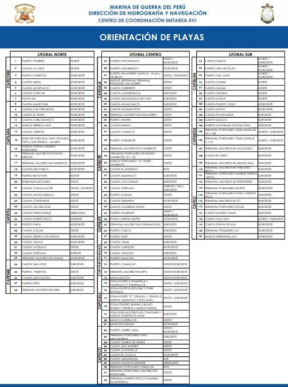 O edital da Diretoria de Hidrografia e Navegação inclui uma lista de praias, enseadas, cais e terminais portuários da costa peruana, com a orientação de cada área voltada para o mar. Esta informação permite identificar em que locais o impacto das ondas anormais é sentido com maior intensidade.