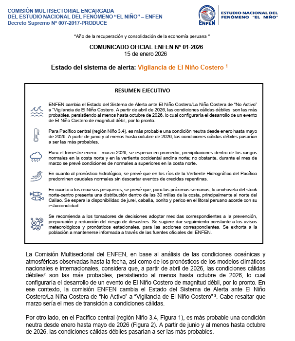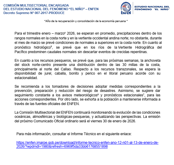 Vasquez lembrou que Enfen era um comitê multidisciplinar IMARPE, SENAMHI, Instituto Geofísico do Peru, ANA, CENEPRED, INDESI, Diretoria de Hidrografia e NavegaçãoSeus especialistas avaliam constantemente as variáveis ambientais para fornecer previsões atualizadas.