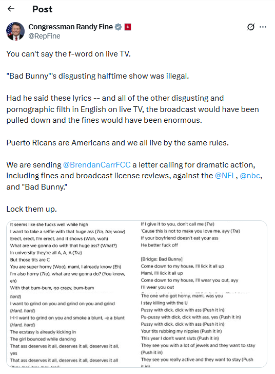 Fine argumentou que a letra interpretada por Bad Bunny continha palavras como “dick”, “ass” e “fuck” que não podiam ser transmitidas pelo ar nos Estados Unidos. O parlamentar afirma que se essas palavras tivessem sido ditas diretamente em inglês, a transmissão teria sido suspensa e multada.