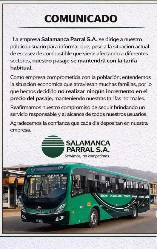 As empresas de transporte público que manterão as tarifas inalteradas incluem: Salamanca Paral SA, que cobre a rota Pachacamac-Carabaylo, e Transportes Cruz del Centro SA, que vai de Carabailo a Aet. Eles esclareceram sua posição por meio de declarações oficiais.