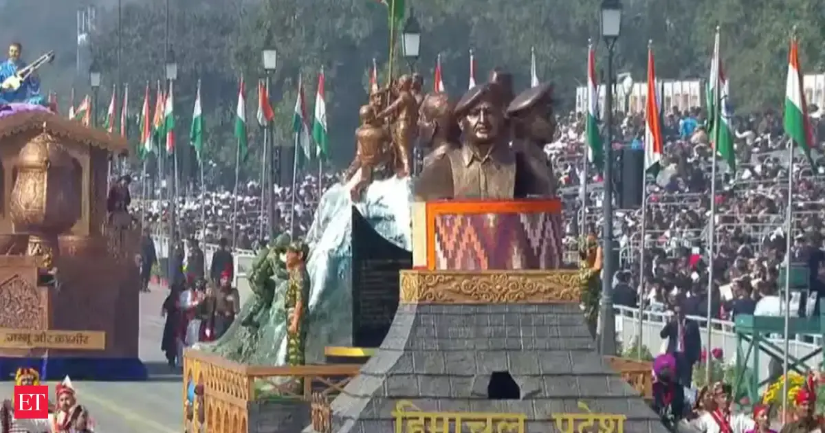Centrado em “Dev Bhoomi, Veer Bhoomi”, o quadro homenageou a contribuição de Himachal Pradesh para as forças armadas, destacou os vencedores do prêmio de bravura e combinou herança espiritual com proeza militar.