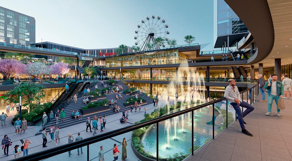 O complexo incluirá 345 territóriosQuatro lojas âncoras, praça de alimentação, esplanadas, cinema, animação e posto médico. Será colocado em frente a uma estação Linha 1 do Metrô de LimaGarante alto tráfego. Limites de investimento S/ 900 milhões.