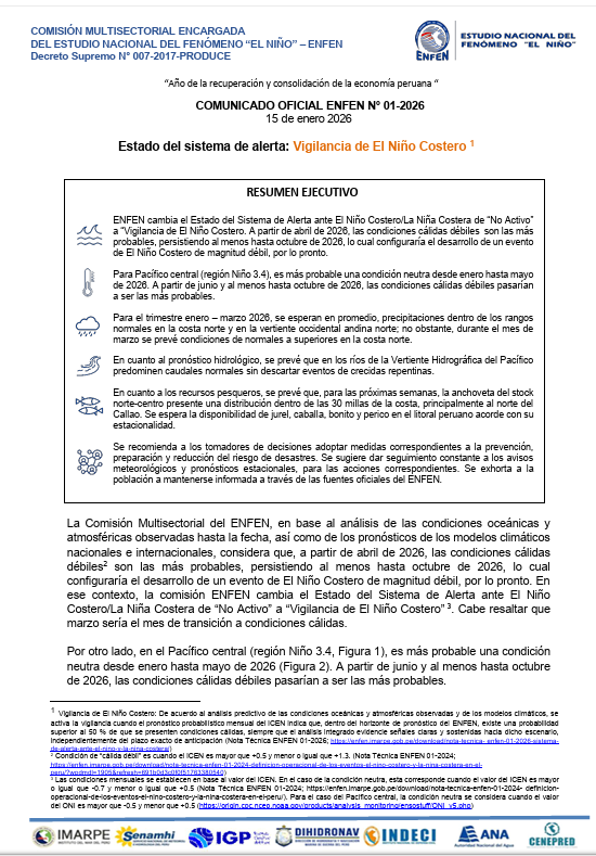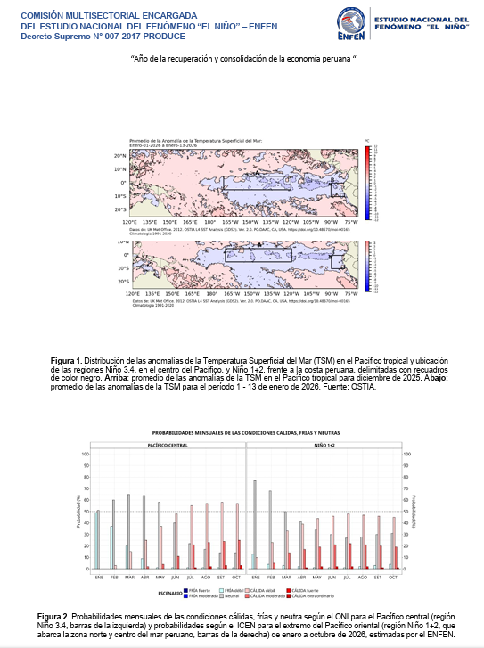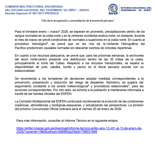 A publicidade faz parte disso Notificação Oficial ENFEN nº 01-2026Ele detalha o comportamento esperado do oceano e da atmosfera nos próximos meses e os principais impactos nas chuvas, nos rios e nos recursos pesqueiros ao longo da costa peruana.
