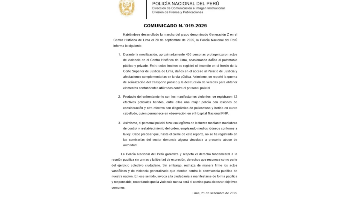 Apesar das evidências de testemunhos e gráficos publicadas em redes sociais, o PNP negou a responsabilidade em um comunicado publicado em seu X. “Nosso compromisso é garantir que toda a mobilização seja realizada em ambiente seguro“No entanto, os testemunhos de jornalistas e manifestantes contradizem esta versão.