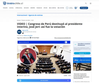 - A BioBioChile publicou: “Congresso do Peru demite o presidente interino José Gerry: foi assim que a votação foi feita.”