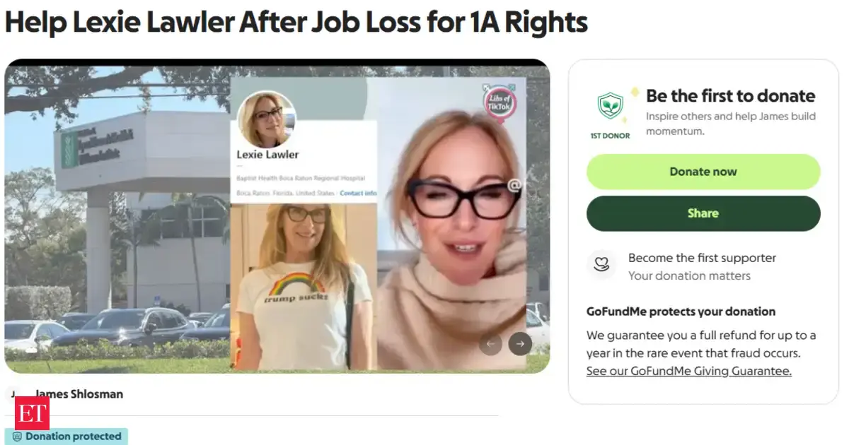 A página de arrecadação de fundos do gofundme afirma que Lexie Lawler perdeu o emprego por motivos da Primeira Emenda e está pedindo US$ 35.000 em doações. A sua autenticidade e reivindicações não foram verificadas por fontes independentes.