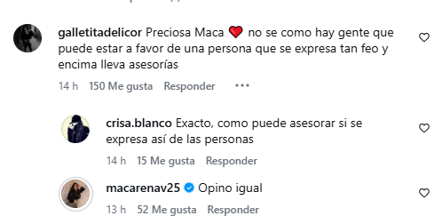 Macarena Vélez se defende e apoia opinião que critica Johanna Cubillas