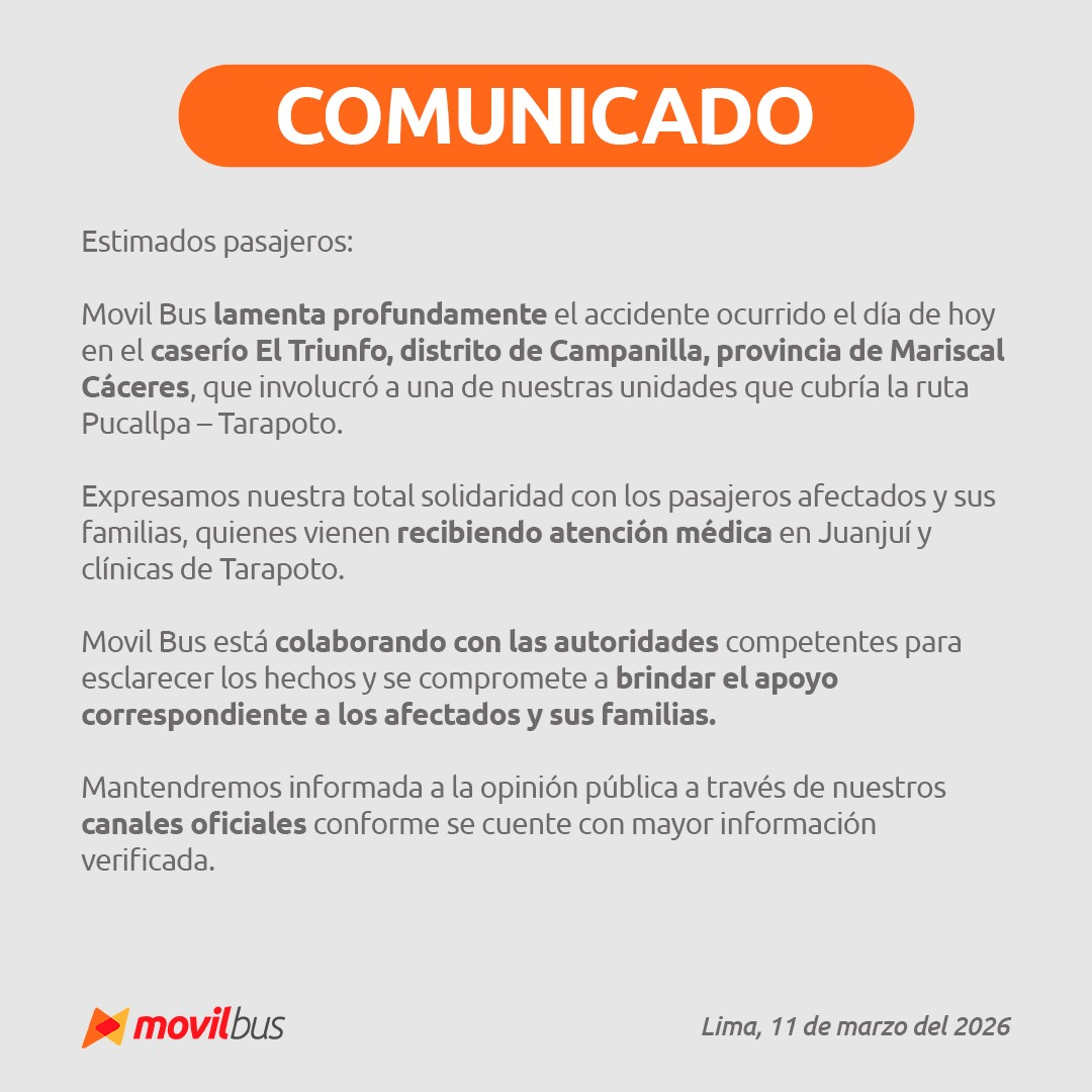 Em seu comunicado, a Movil Bus expressou sua solidariedade às vítimas e confirmou que os afetados já recebem atendimento médico especializado no Centro de Saúde Juanjui e em diversas clínicas de Tarapoto.