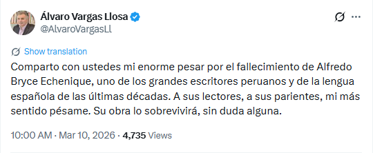 Em sua publicação, ele escreveu: “Compartilho com vocês minha grande tristeza pela morte de um dos melhores escritores peruanos e de língua espanhola das últimas décadas, Alfredo Bryce Ecanic. Minhas mais profundas condolências a seus leitores e familiares.