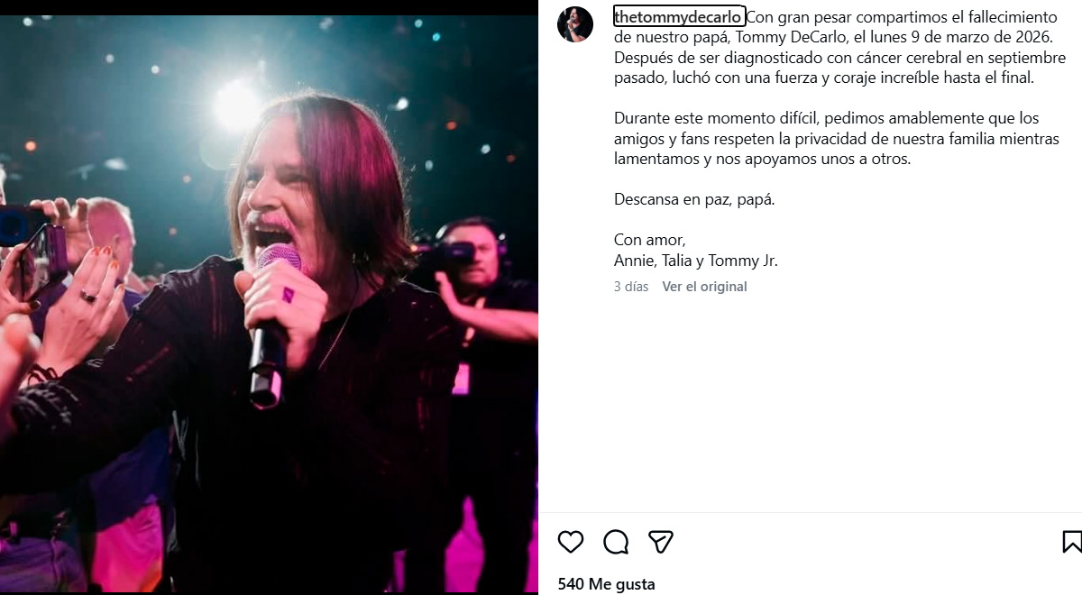 Cantora americana Tommy DeCarlo Ele morreu de câncer no cérebro na última segunda-feira, 9 de março. A infeliz notícia foi confirmada por seus filhos, que ficaram visivelmente afetados e compartilharam o anúncio e expressaram sua profunda dor após a saída do artista.