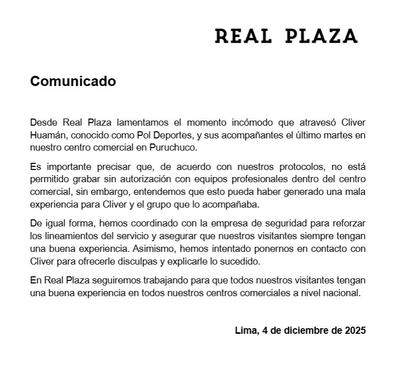 O Centro Comercial Real Plaza não demorou a emitir um comunicado em que lamentava a situação que Cliver Human, conhecido como “Paul Deportes”, passou na loja de Puruchuko, em resposta a reclamações nas redes sociais. Da mesma forma, decidiu que é proibido todo tipo de gravação dentro do shopping sem a correspondente autorização.