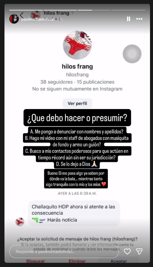 “O que devo fazer ou me gabar?” Ele escreveu pela primeira vez revelando sua confusão ao mostrar uma captura de tela da conversa de uma conta anônima. O tom da mensagem era claramente ameaçador: “Challakito HDP, agora observe as consequências. Você será notícia”, diz a imagem.