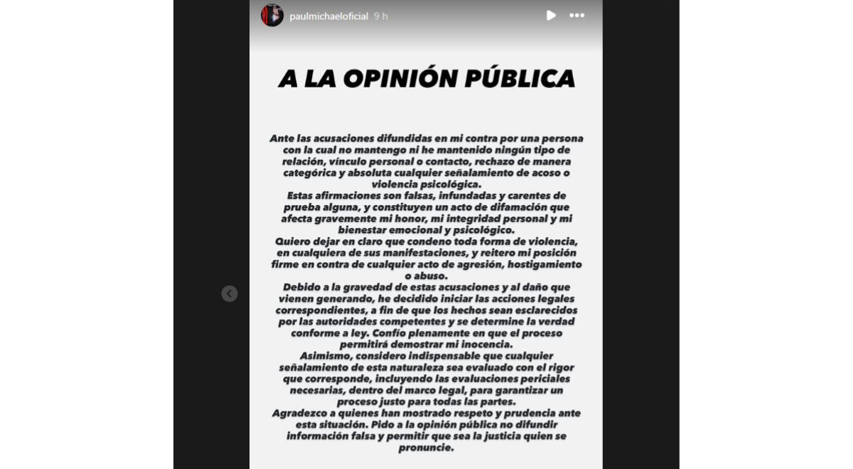 “À luz das alegações feitas contra mim por uma pessoa com quem não tenho qualquer relação, relação pessoal ou contacto de qualquer espécie, nego completamente qualquer alegação de assédio ou tortura mental. Estas declarações são falsas, infundadas, sem provas e são declarações difamatórias que afectam gravemente o meu estado mental. Paulo Miguel.
