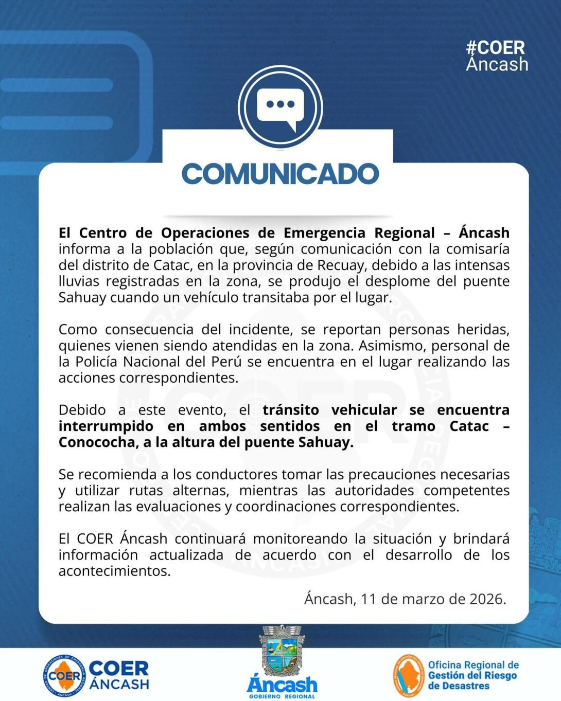 As fortes chuvas no Peru causaram várias emergências em todo o país. Um deles aconteceu na noite da última quarta-feira, 11 de março A ponte Sahuai desabou quando um veículo trafegava nos trilhos. Uma pessoa morreu e outras três ficaram feridas no acidente. O infeliz incidente ocorreu no distrito de Katak, em Rekuwe, Ankash.