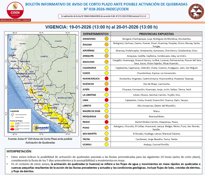 De acordo com a notificação emitida pelo Senamhi N°019, o fenômeno meteorológico ocorrerá na tarde de segunda-feira, 19 de janeiro, e terça-feira, 20 de janeiro, nas seguintes áreas, que apresentamos a seguir: