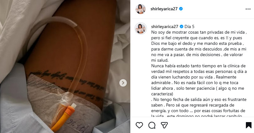 Através de suas redes sociais, Shirley Arica Ele publicou uma mensagem extensa e sincera com fotos do centro de saúde. “Não sou de ser tão reservada sobre minha vida, mas sou uma crente fiel quando se trata disso. Bem, meu descuido, meu ‘isso não vai acontecer comigo’, minhas decisões, minha saúde, Deus colocou o dedo sobre mim e enviou este julgamento para mim”, escreveu ela, refletindo.