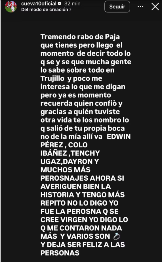 Além disso, Tenchi Ugas Ele enfatizou que era um homem de fé. “Ela sabe que sou um homem fiel que não bebe, não fuma, não dança junto, não faz mercado, não lava, passa, cozinha, limpa, etc.”, escreveu ele. Da mesma forma, como ele afirmou, muitos de seus conhecidos encaminharam para ele o depoimento que Cueva fez em seus stories do Instagram, incentivando-o a escrever.