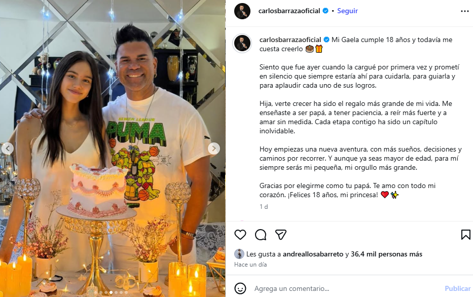 “Hoje você inicia uma nova aventura, com mais sonhos, decisões e caminhos para seguir. Não importa quantos anos você tenha, para mim você sempre será minha garotinha, meu maior orgulho.. Obrigado por me escolher como seu pai. Eu te amo de todo o coração. Feliz 18 anos, minha princesa!”Ele adicionou Carlos ‘Tomate’ Barraza.