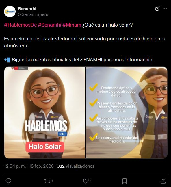 De acordo com o Instituto Geofísico do Peru (IGP). Um halo solar ocorre quando a luz solar passa através de milhões de minúsculos cristais de gelo suspensos em nuvens altas conhecidas como nuvens cirros. Esses cristais atuam como pequenos prismas e refratam a luz para criar um círculo brilhante de cores semelhantes às do arco-íris.