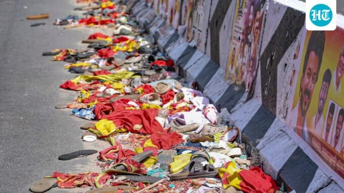 Durante o ator e Tamilaga Rally Vetri Kazhagam (TVK) Vijay, no distrito de Karur, Tamil Nadu. (PTI Ensemble), deitado na estrada e outras coisas que as pessoas ficam na estrada e Tamil Nadu.