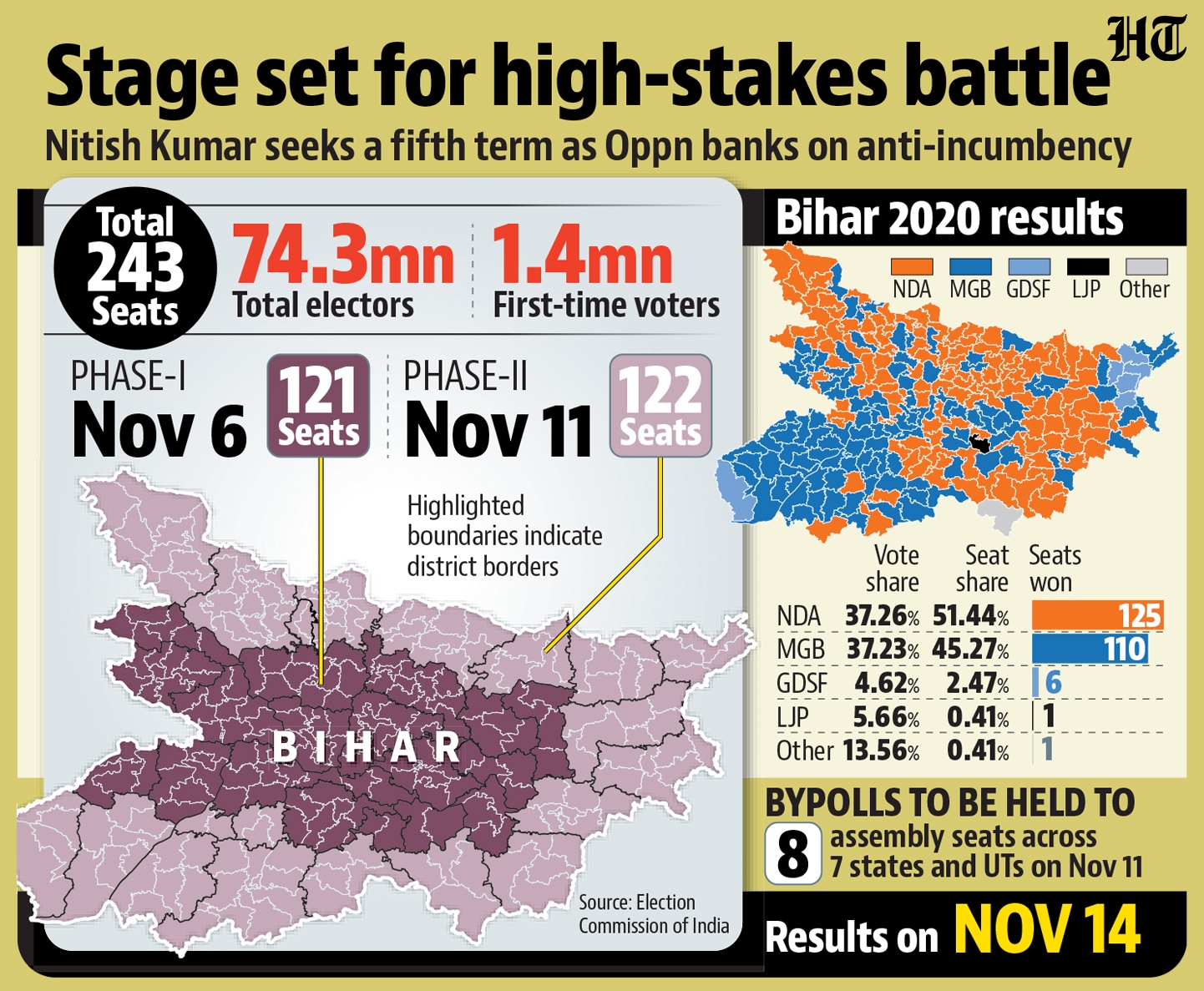 A Comissão Eleitoral da Índia anunciou na segunda -feira que as eleições na Assembléia de Bihar serão realizadas em duas fases em 6 de novembro e 11 de novembro, contando em 14 de novembro. Essa será a primeira escolha principal de acordo com o principal comissário eleitoral Gyanesh Kumara e vem no meio do controle sobre a credibilidade da comissão e o tratamento dos eleitores.